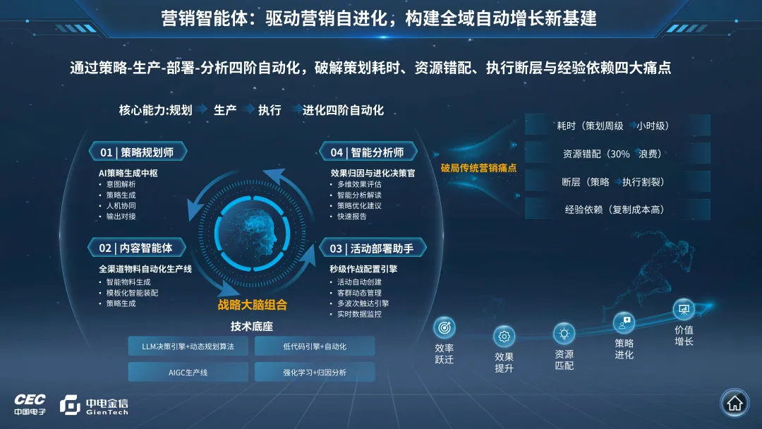 该方案以“营销智能体”为核心,融合AI技术对营销全链路进行重构,深度挖掘数据价值,借助预测模型与实时响应机制,提升触达的精准度;运用自动化流程释放人力资源,并依托持续学习来优化营销策略;实现从客户洞察、策略生成,到执行部署、效果复盘的端到端自动化与智能化,有助于金融营销从“规则驱动”向“智能体协同”的跨越式升级。
