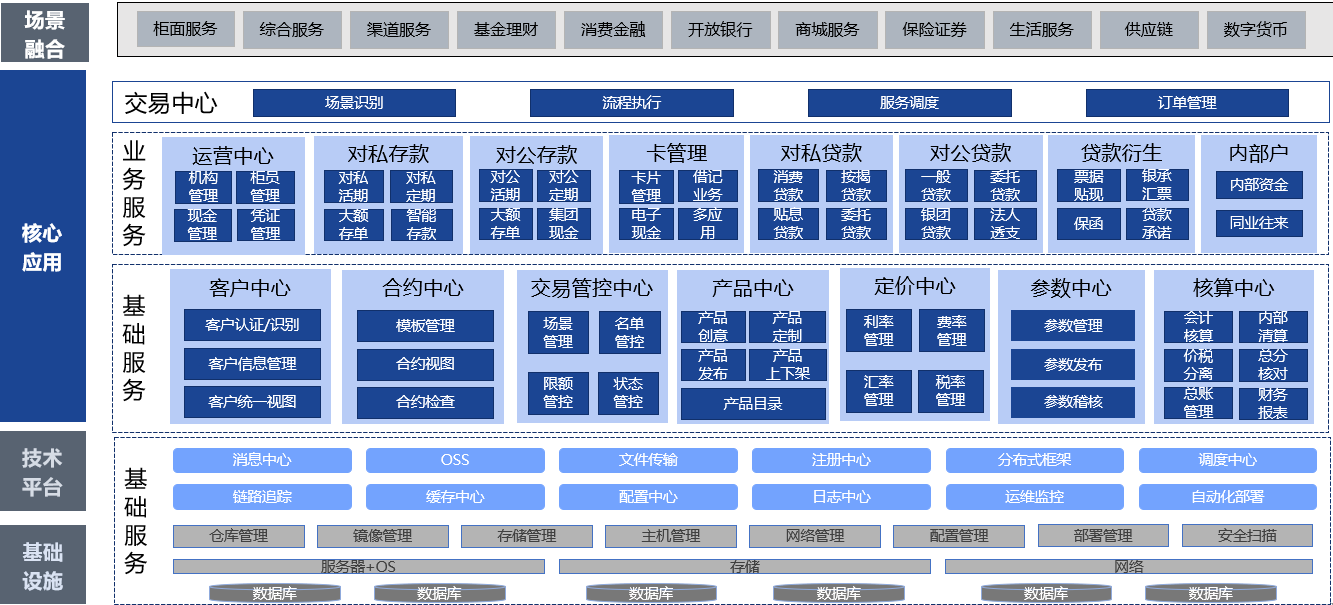 系统深度融合业务功能,顺利获得精心抽象与重构,搭建起客户中心、合约中心、产品中心、定价中心、参数中心以及核算中心等中台服务组件,显著提升了公共服务效能。与此同时,系统还打造了涵盖存款业务、贷款业务、卡业务、公共运营以及内部账等领域的业务服务组件。这些组件彼此保持松耦合关系,遵循“去中心化”理念,支持插件式部署,为产品与服务的创新给予了坚实支撑。